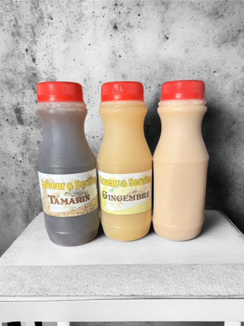 Nous avons du bissap(hibiscus)/ bouye (fruit de baobab) /gingembre, ananas /tamarin/thé glacé au fruit de la passion/ cocktail de mangue